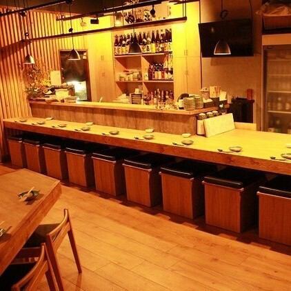 木の温もりを感じられる落ち着いた雰囲気の店内は、お一人様でも気軽にご来店できるカウンター席をはじめ、各種飲み会などにご利用可能なテーブル席も完備しております。